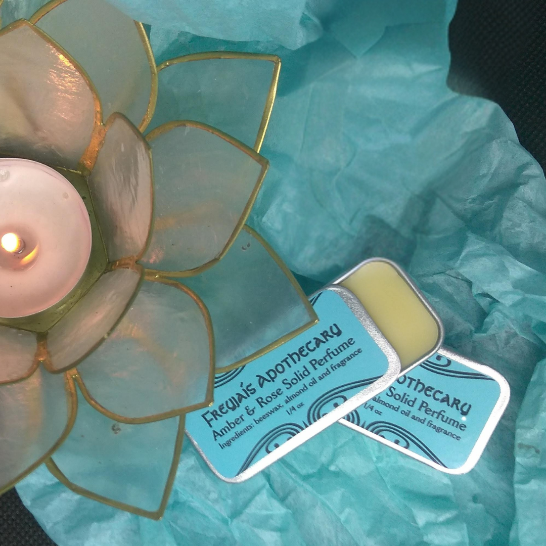 Two luxurious scents put together. Made with beeswax, almond oil, rose oil, amber fragrance oil and rose absolute. 1/4 oz tin.